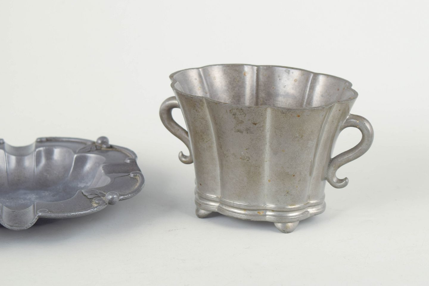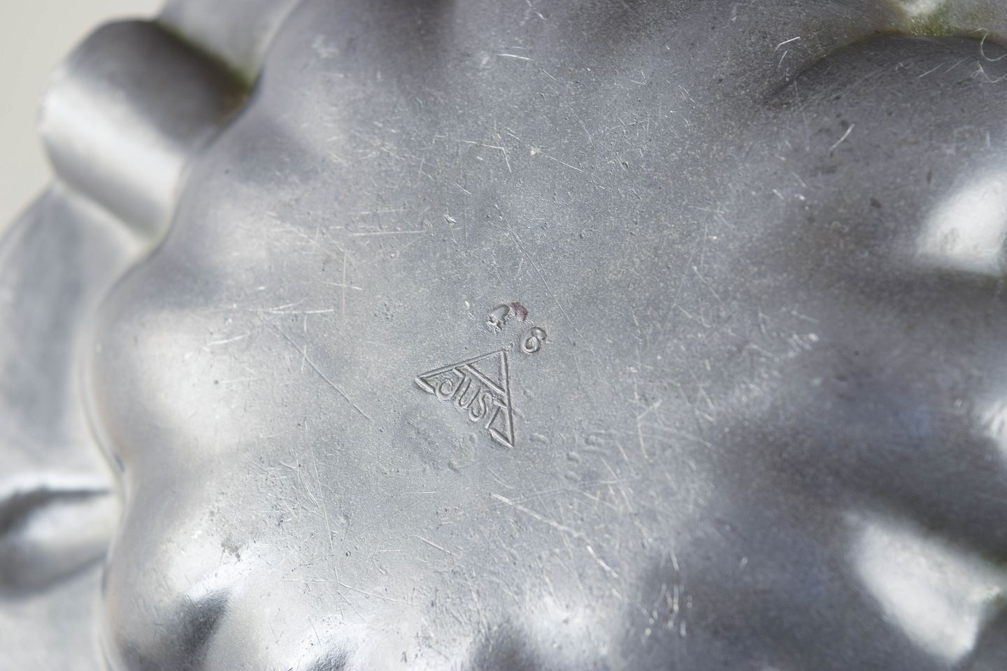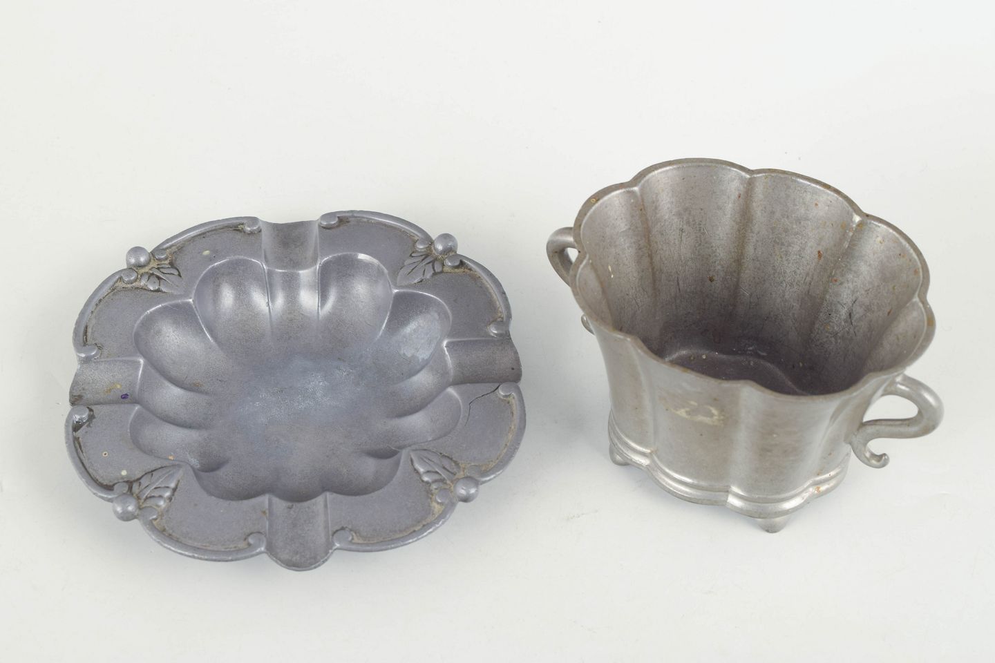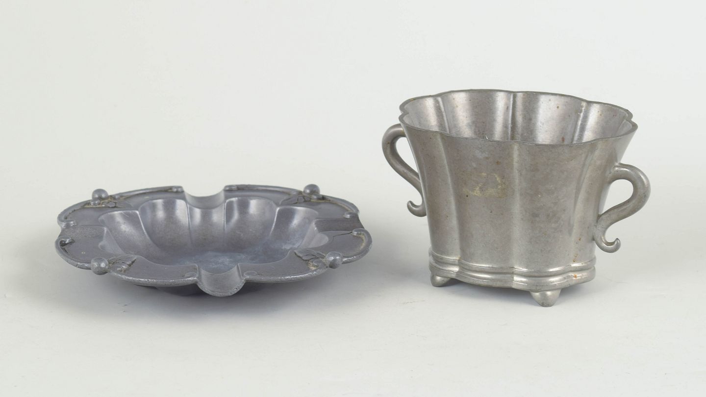 Vase og fad i tin udført i et elegant art deco formsprog med bløde kurver og stiliserede detaljer. Vase model 46. Fad model 1214.