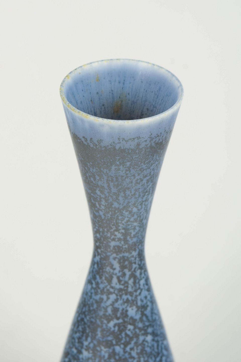 Slender organically shaped stoneware vase with a beautiful blue mottled glaze and a gently constricted neck. A characteristic example of Stålhane’s work with refined forms and nuanced glazing.