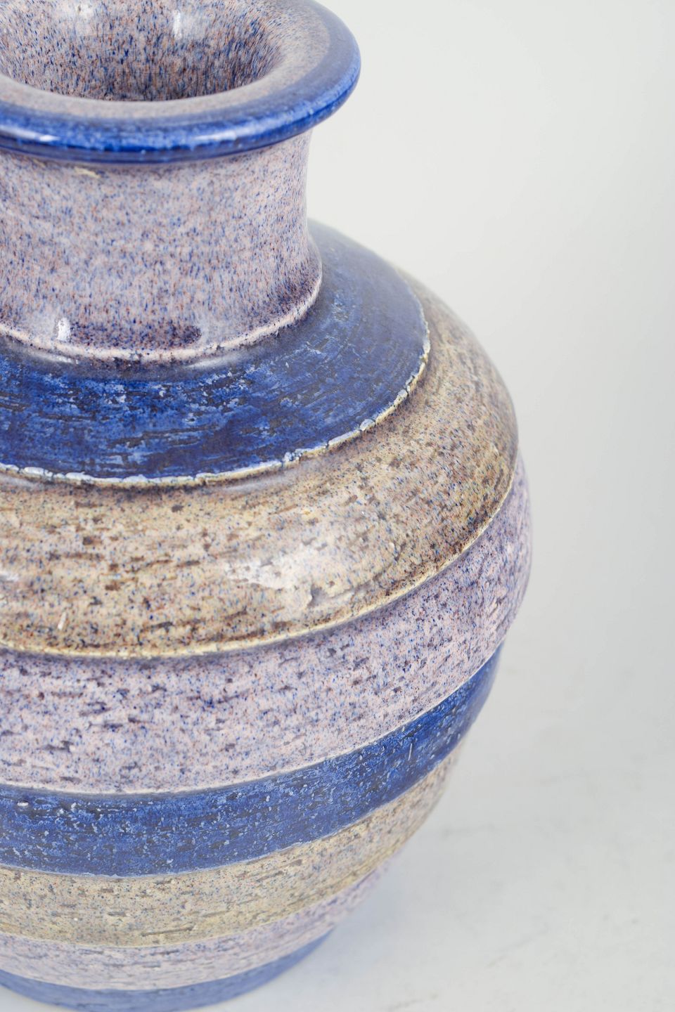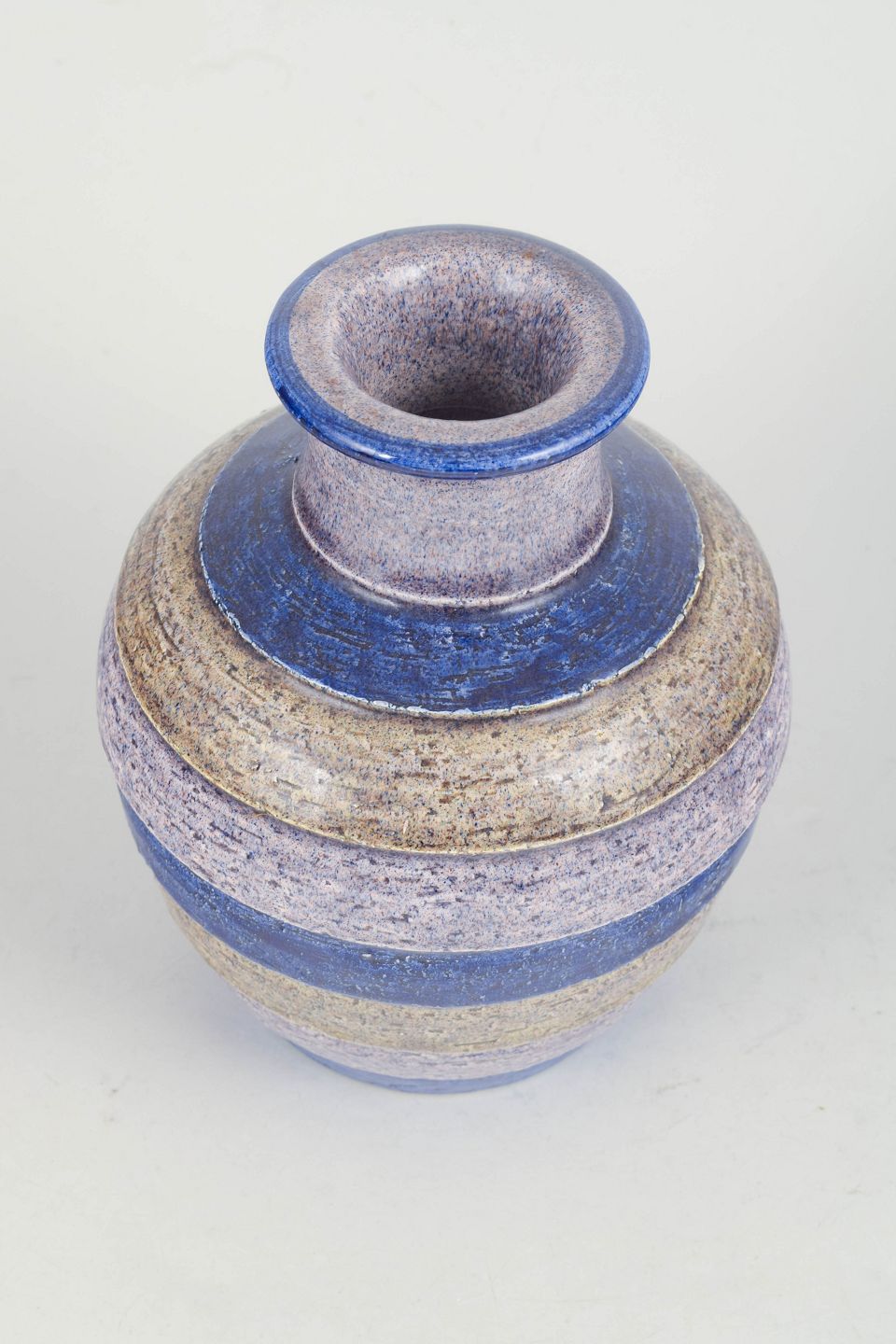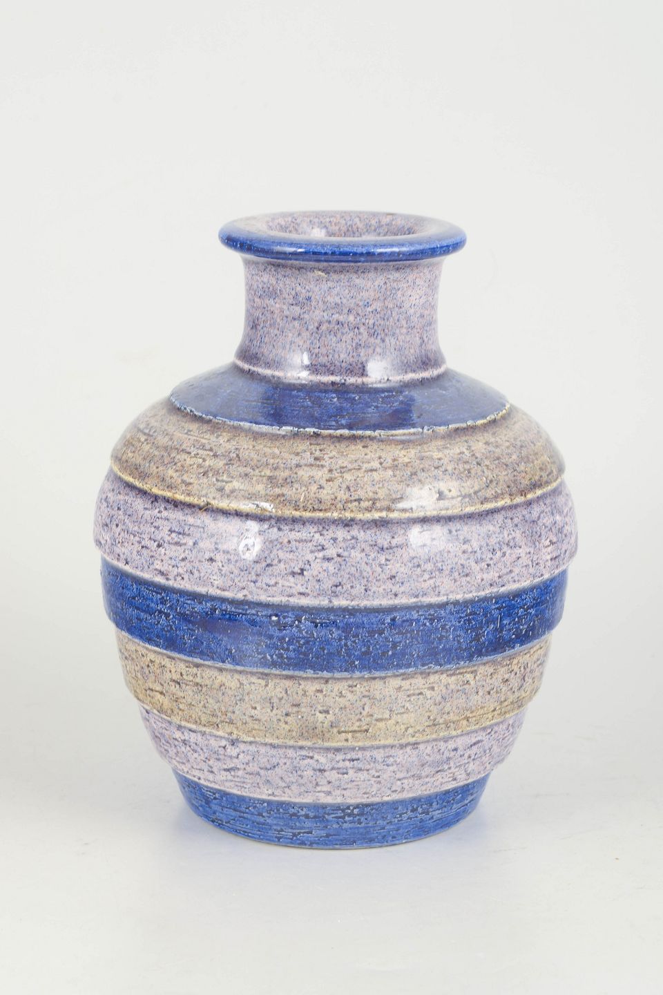 Handmade ceramic vase with concentric rings and characteristic glaze in blue, cream and sandy tones. Produced in the 1970s in Bitossi’s distinctive artistic style.