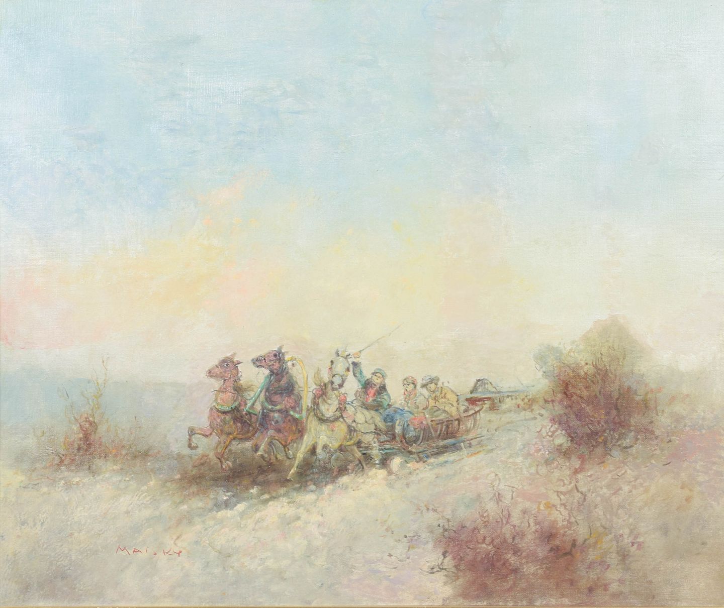 Fedor Maisky (born 1879) was an Austrian painter known for his figurative and often narrative compositions, where landscapes and human activity are integrated into a harmonious whole. His works are characterized by a light, atmospheric brushwork with an emphasis on light, movement, and mood, combining naturalistic observation with an impressionistic approach to colour.