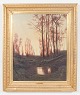 Stemningsfuldt landskabsmotiv med slanke træstammer langs et stille vandløb i varmt aftenslys, udført i en naturalistisk stil med bløde overgange og afdæmpet farvepalette. Signeret nederst.