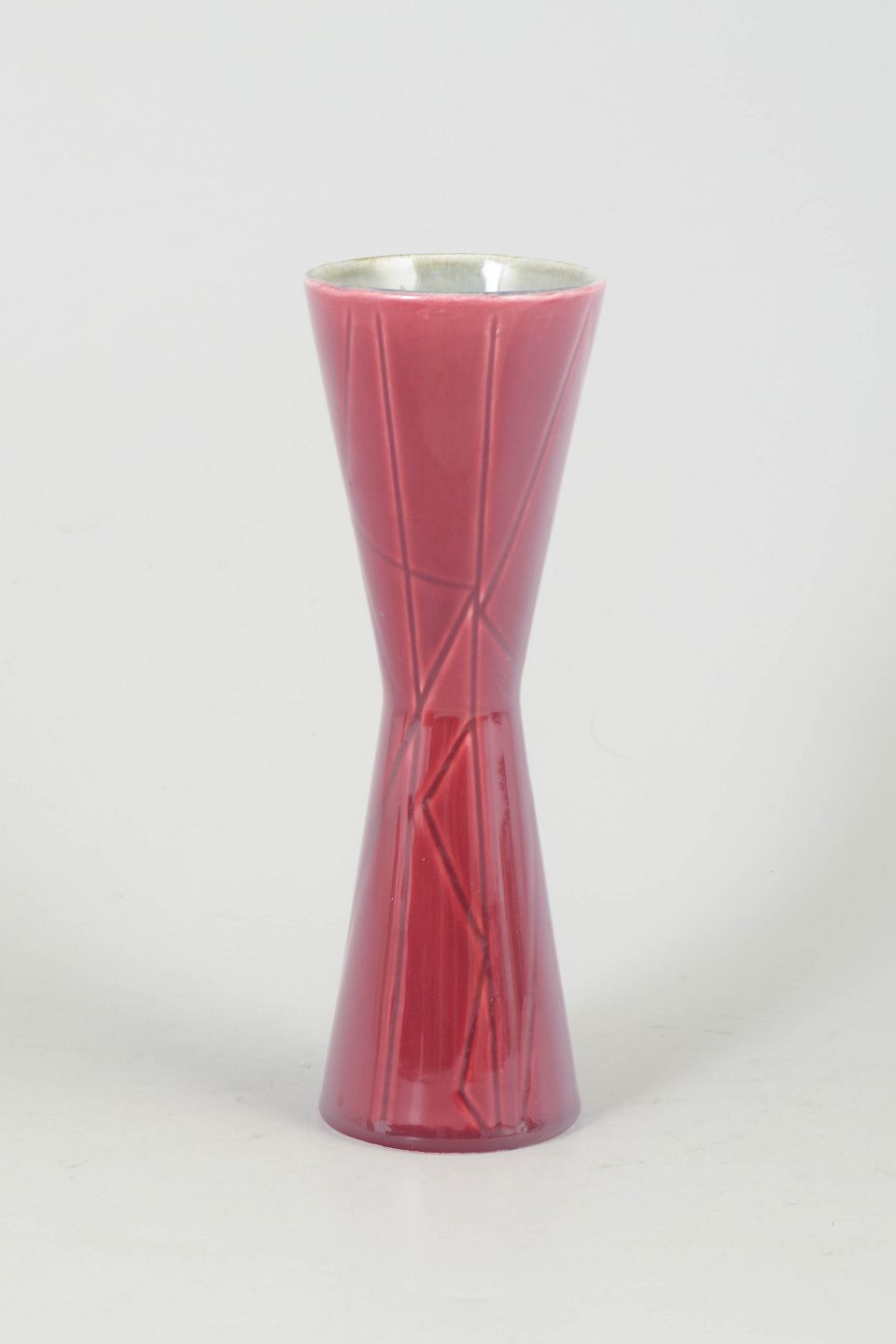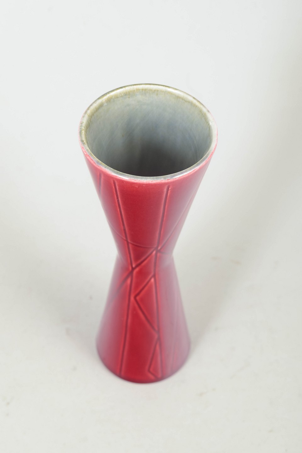 Slender hourglass-shaped vase in glazed stoneware with a deep red glaze and incised decoration. The model "California" is a characteristic example of Stålhane’s refined and disciplined ceramic design from the period.