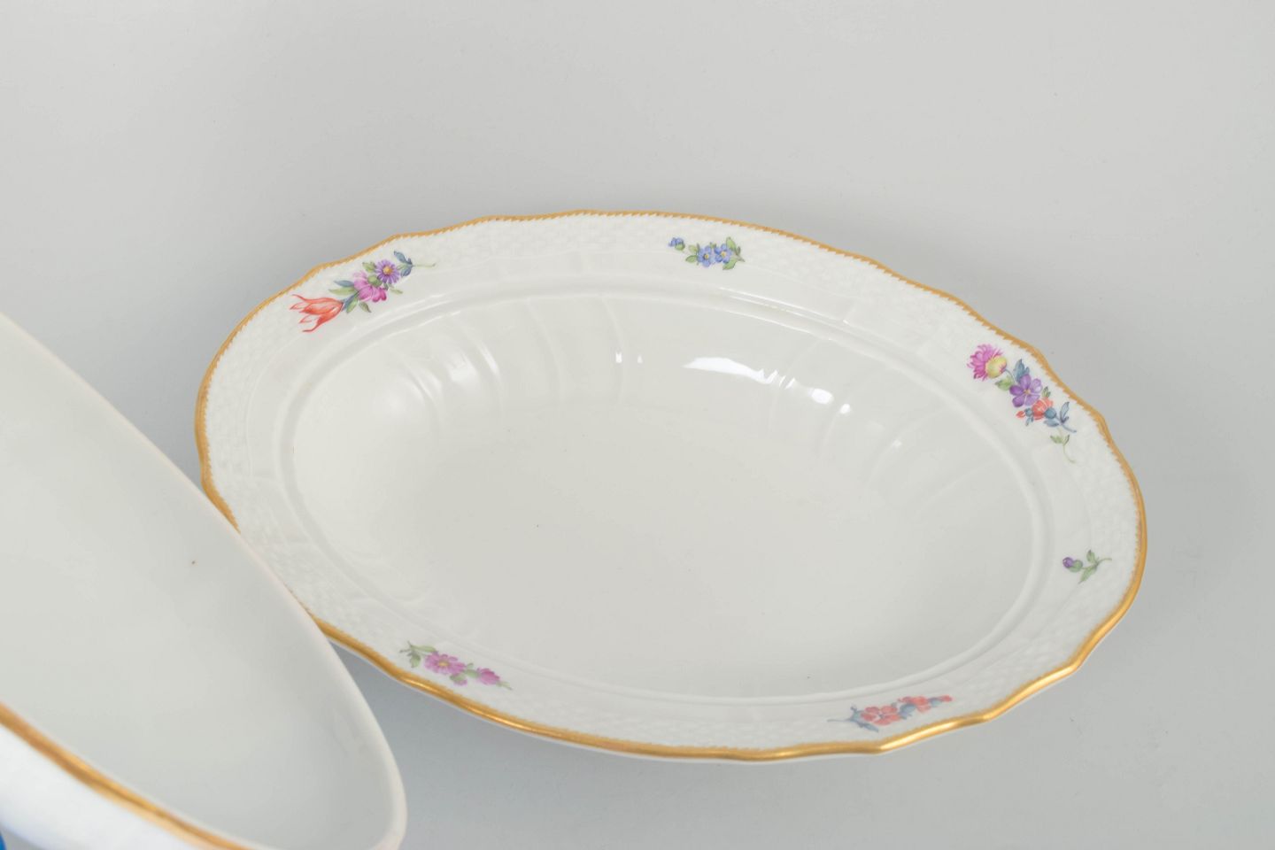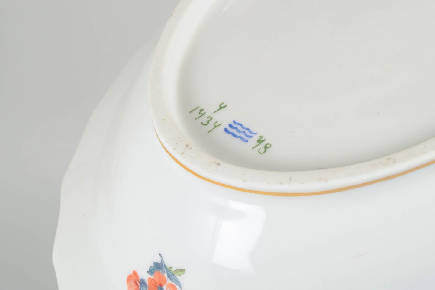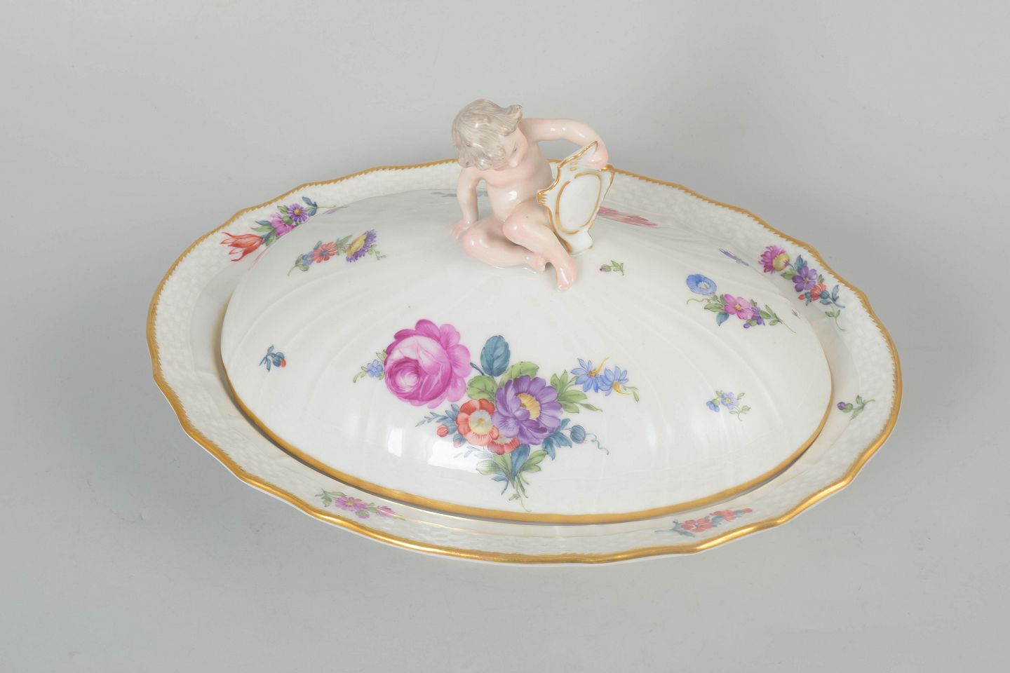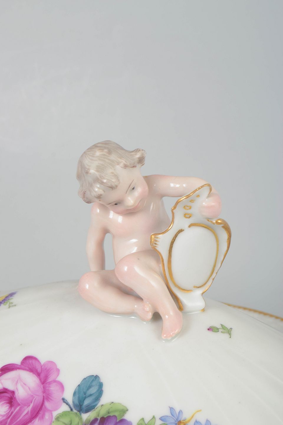 Large oval porcelain lidded bowl with polychrome floral decoration in the Saxon flower pattern and gilded rim. The lid is finished with a knop in the form of a cherub figure. Model 4/1734.