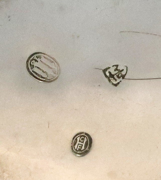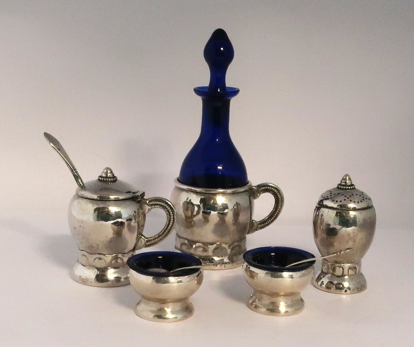 Dansk arbejde. Sølv (830). 2 saltkar med skeer, peberbøsse, sennepskrukke og eddikeflaske. 7 dele. Produceret 1918.