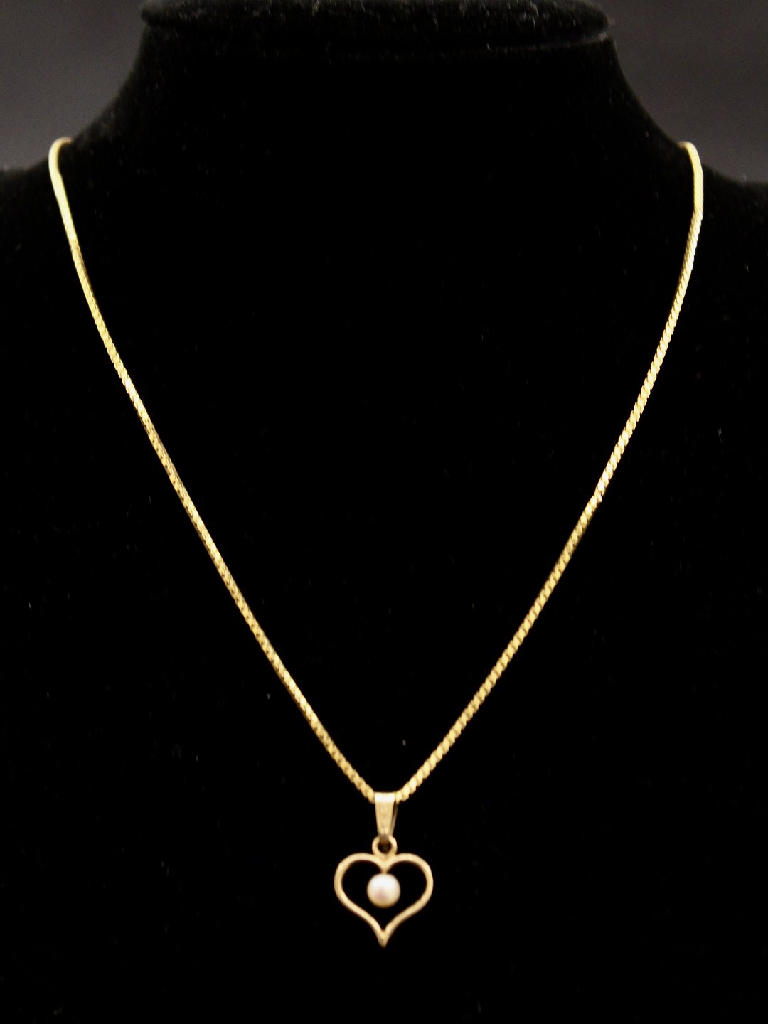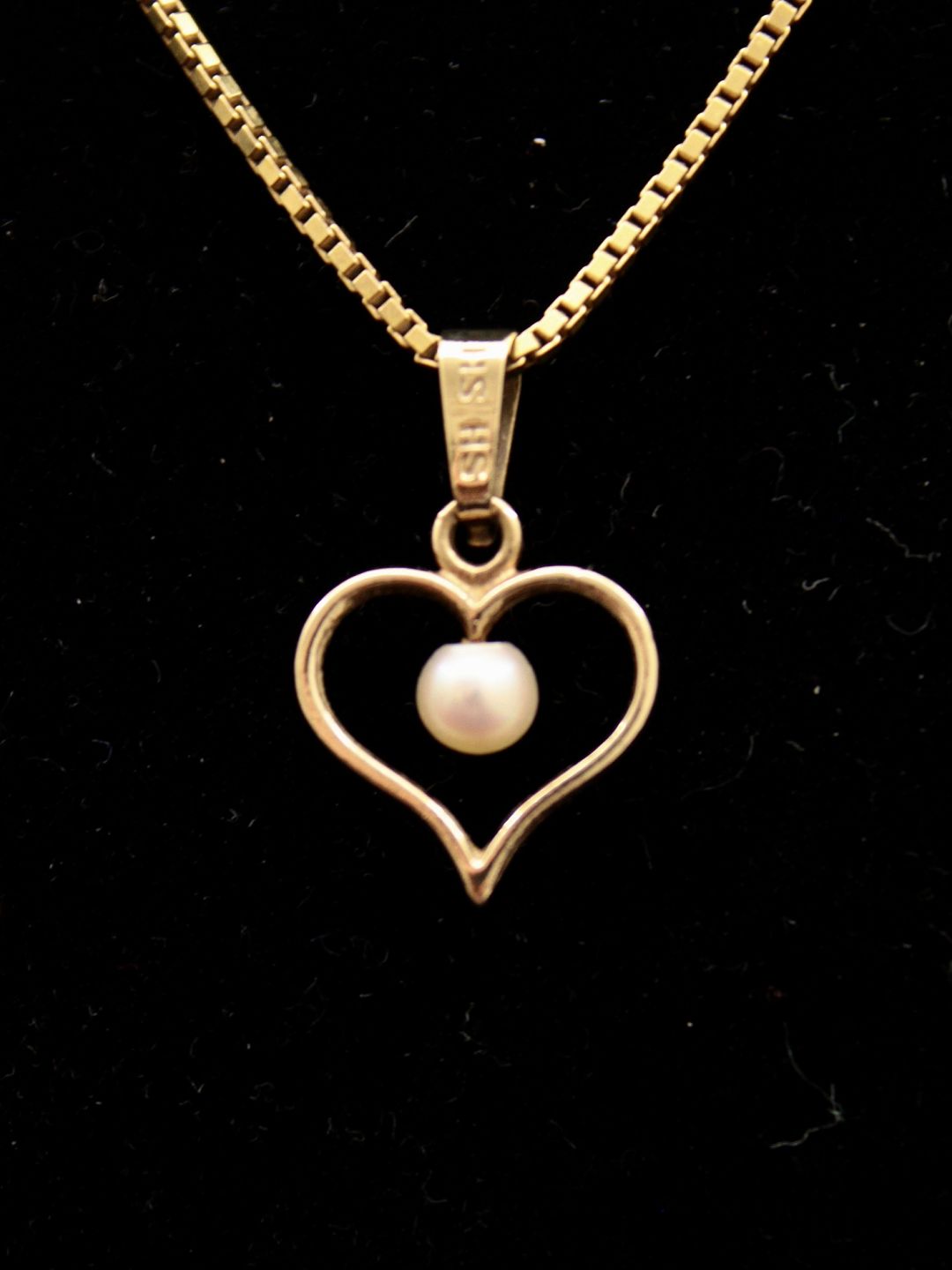 8 karat guld hjerte vedhæng 1,3 x 1,5 med perle med perle fra guldsmed Herman Siersbøl København og 8 karat guld kæde 45 cm. emne nr. 617667
