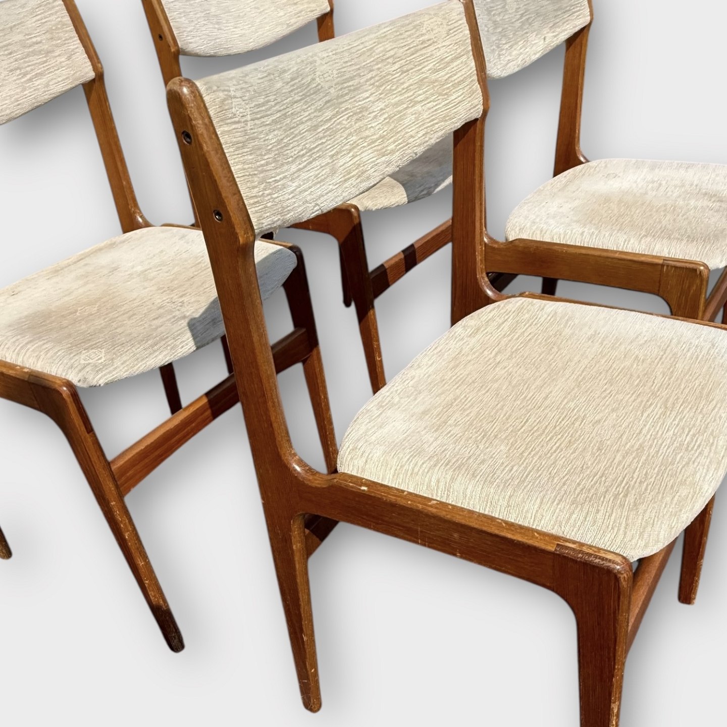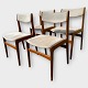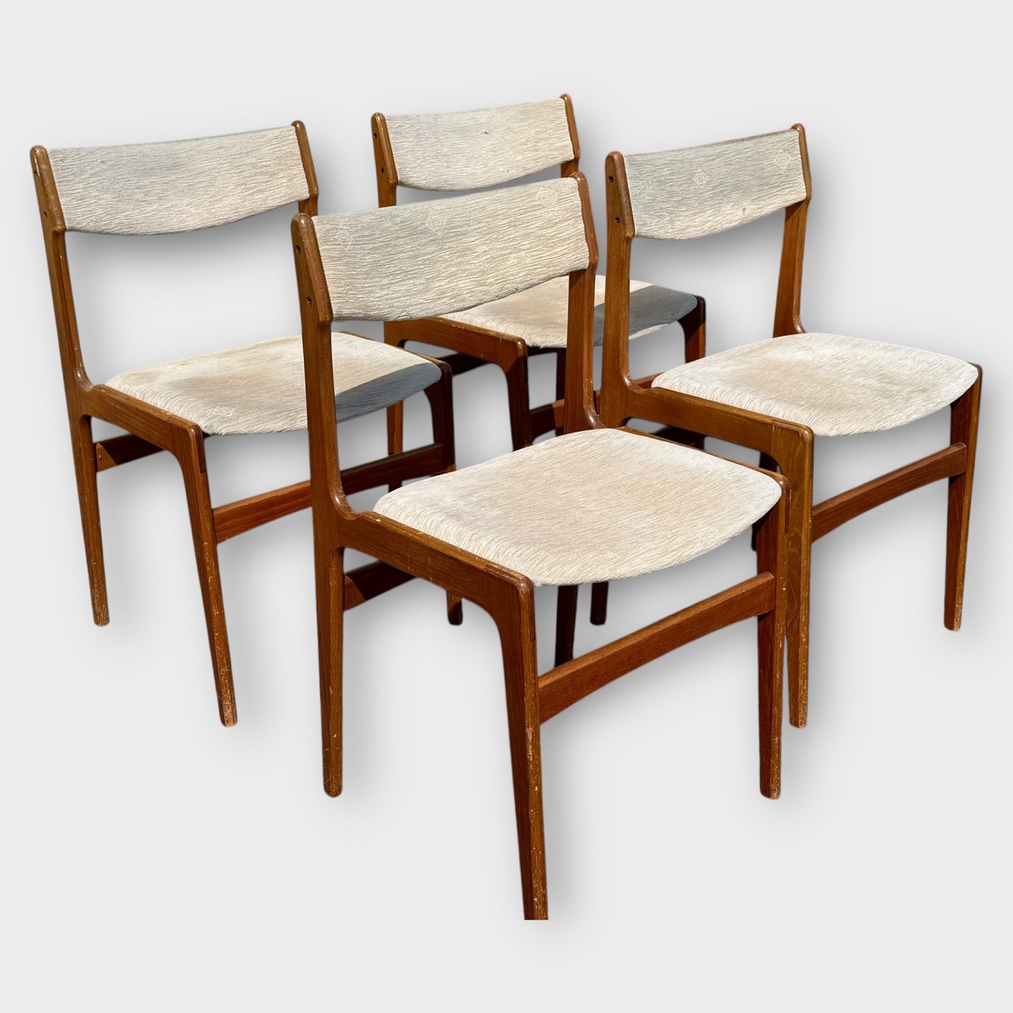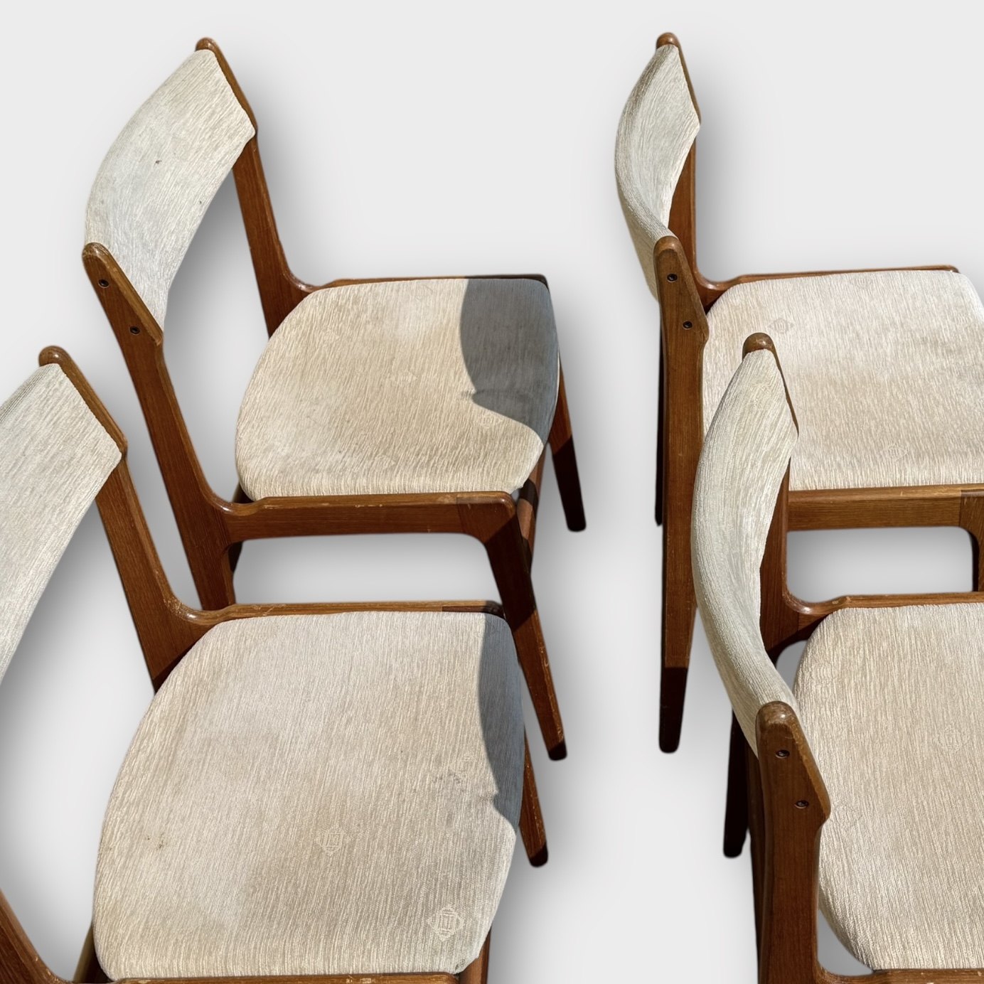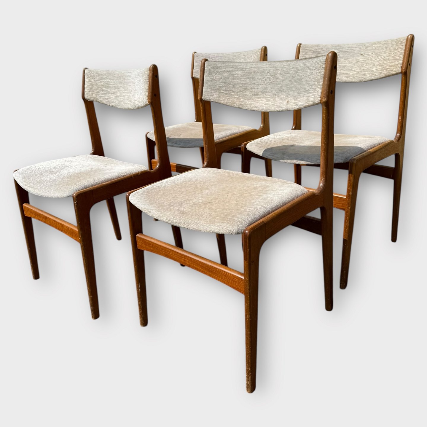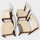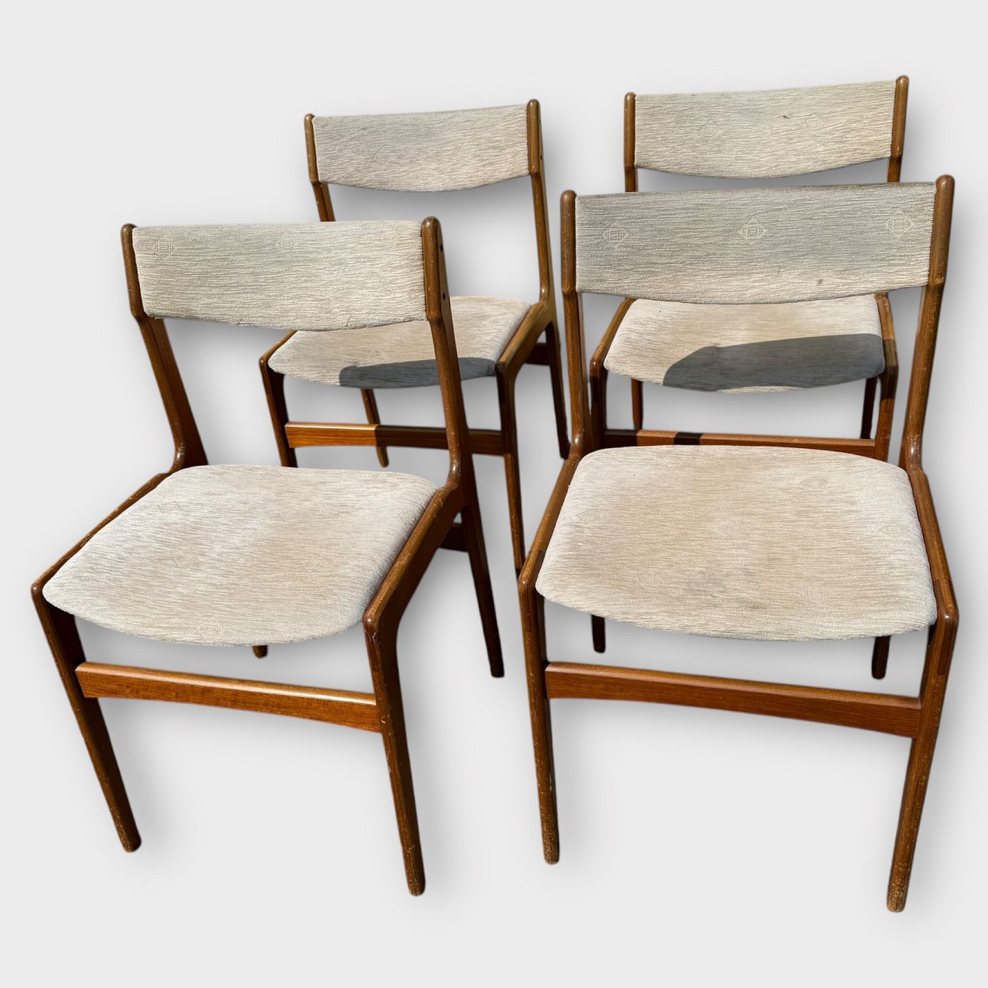 4 dining chairs in teak, slightly stained on the seats, otherwise in good used condition.