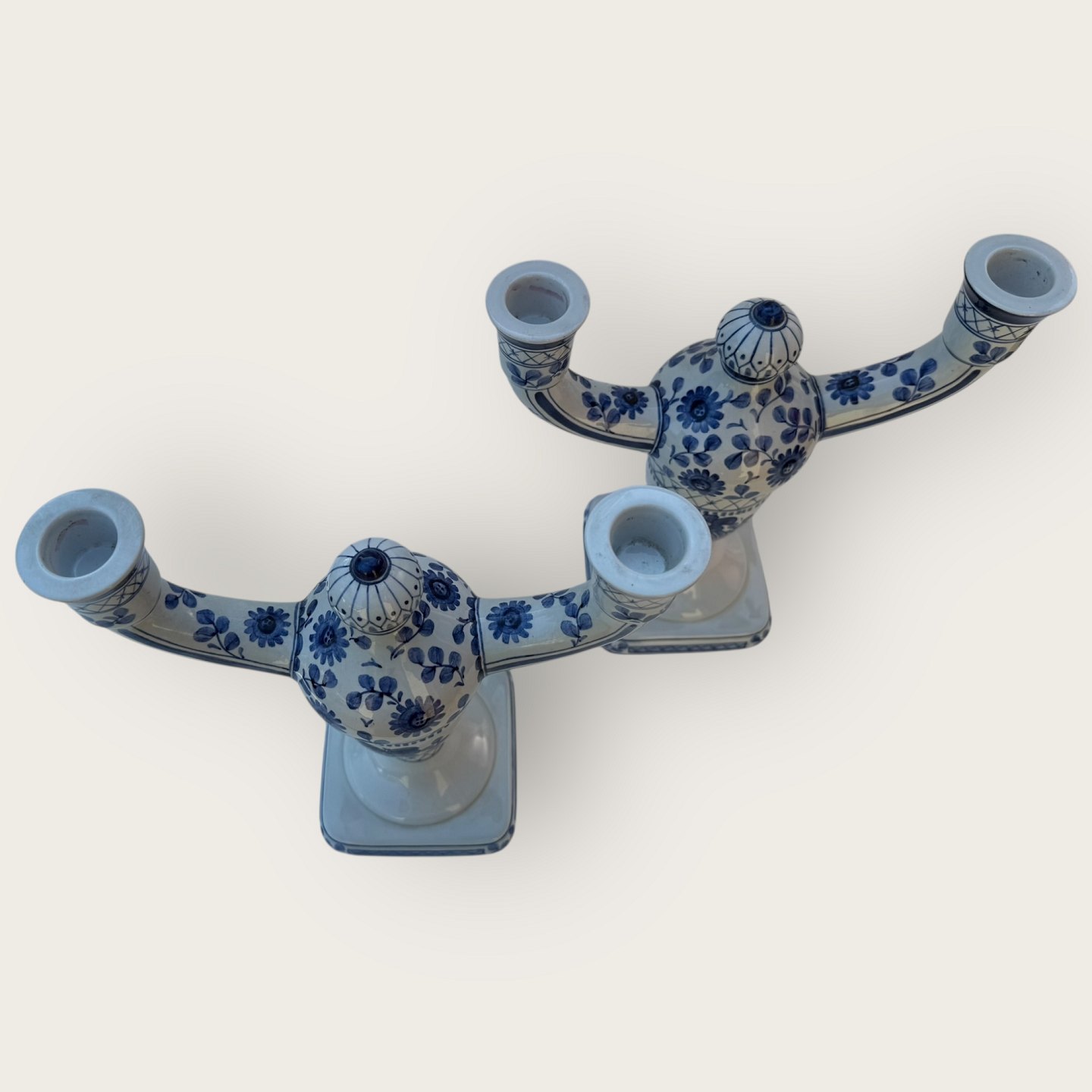 Royal Copenhagen, Aluminia, Tranquebar A set of 2-armed candlesticks, #3037/919, a few small cracks under the glaze, otherwise very good condition, 1st grade, design Christian Joachim, Dimensions for one candlestick: Height 25.5cm, width 22cm, sold together.