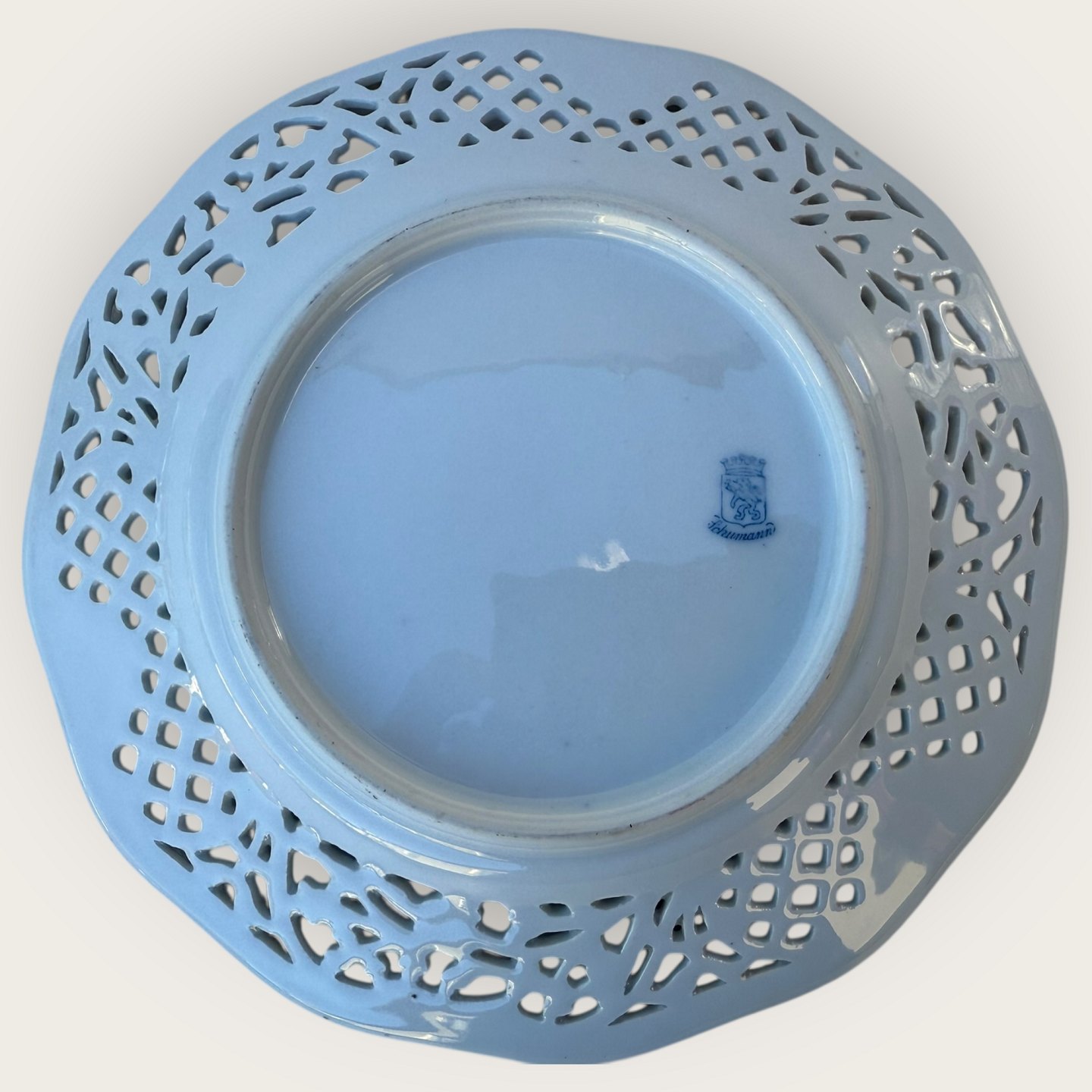 Schumann, Germany, Bowl and 8 plates with openwork rim, some wear on the bowl's gold rim, otherwise good condition, Plate diameter 19cm, Bowl diameter 23cm.