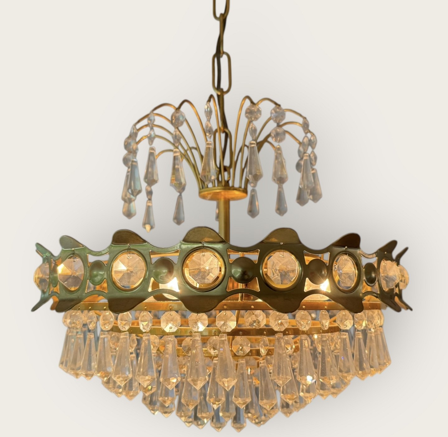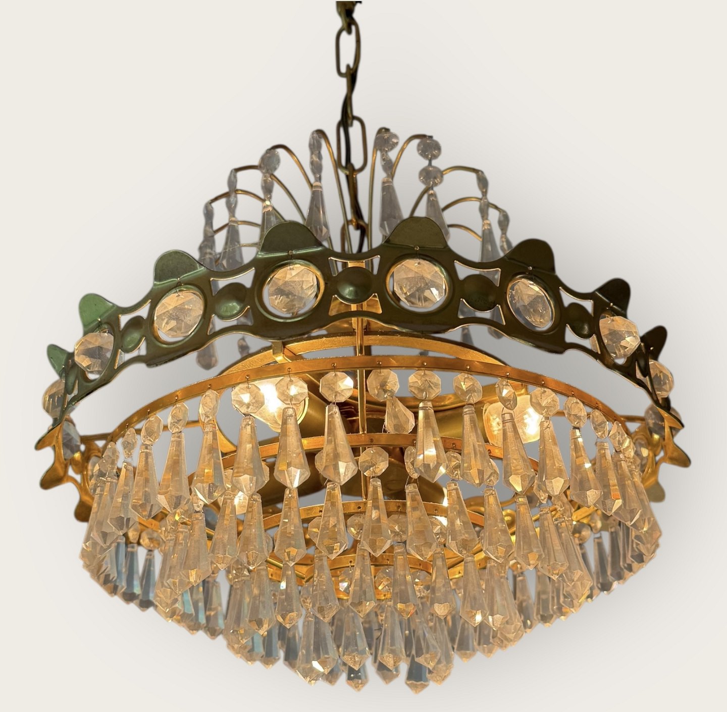 Brass chandelier with many glass prisms, works fine and with all prisms, Diameter approx. 36cm *Nice used condition*