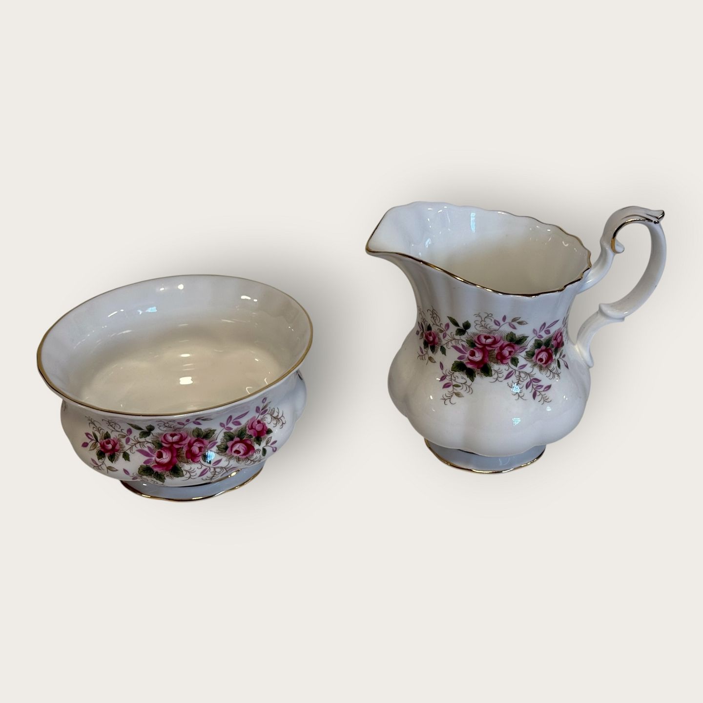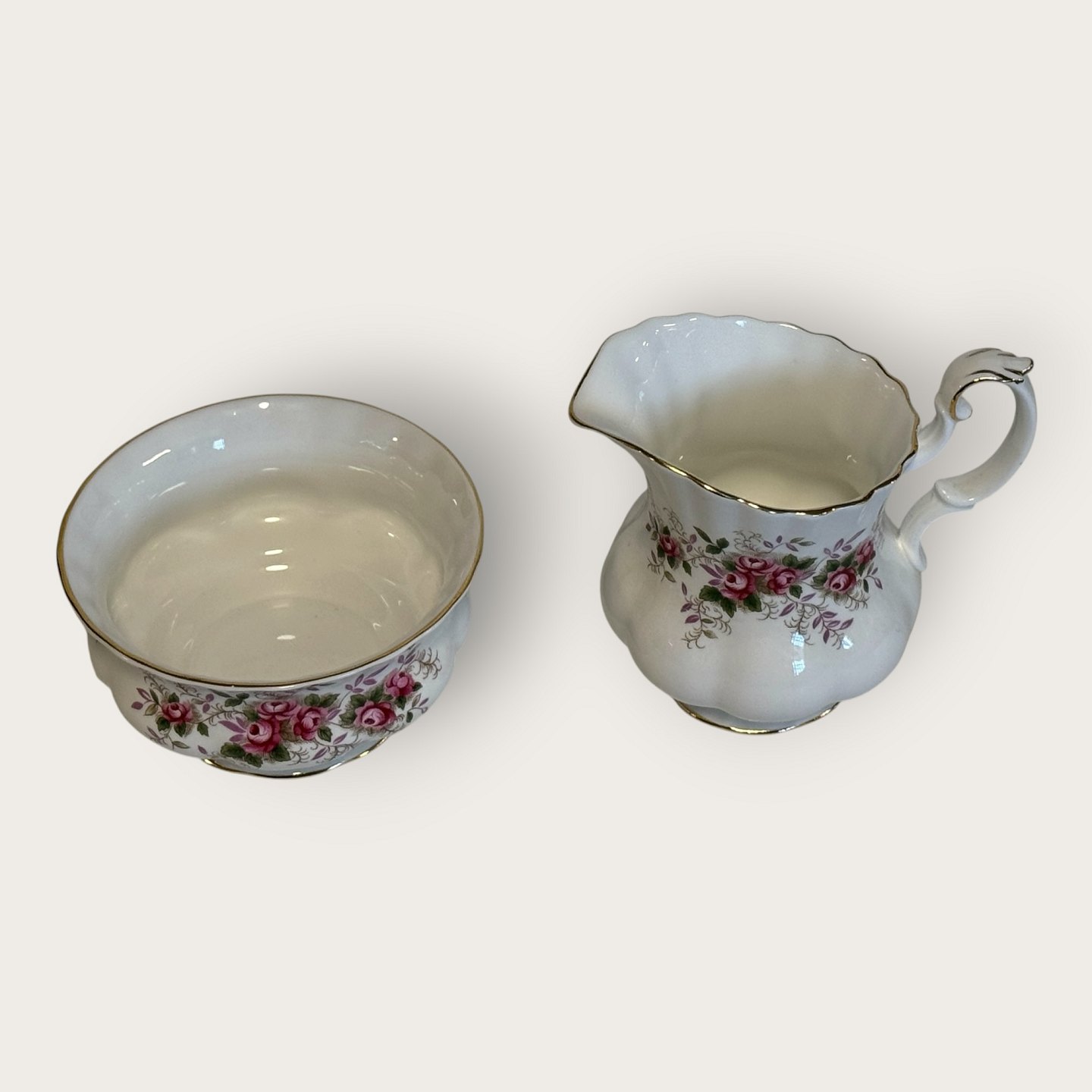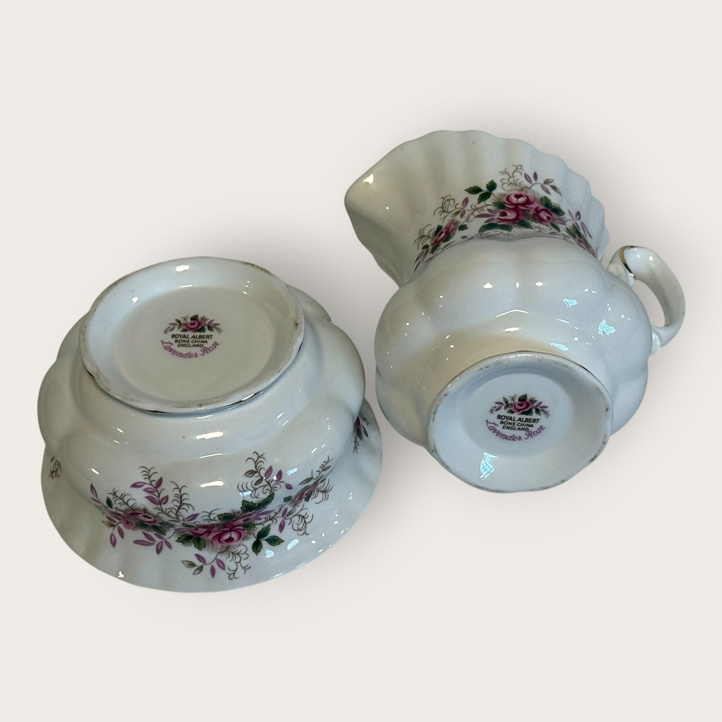 Royal Albert, Bone China, Lavendelrose, großes Zucker- und Sahneset, Zuckerdose Höhe 6 cm, Durchmesser 11 cm, Sahnekännchen ca. H x B x T 10,5 x 12 x 8,5 cm *Perfekter Zustand*
