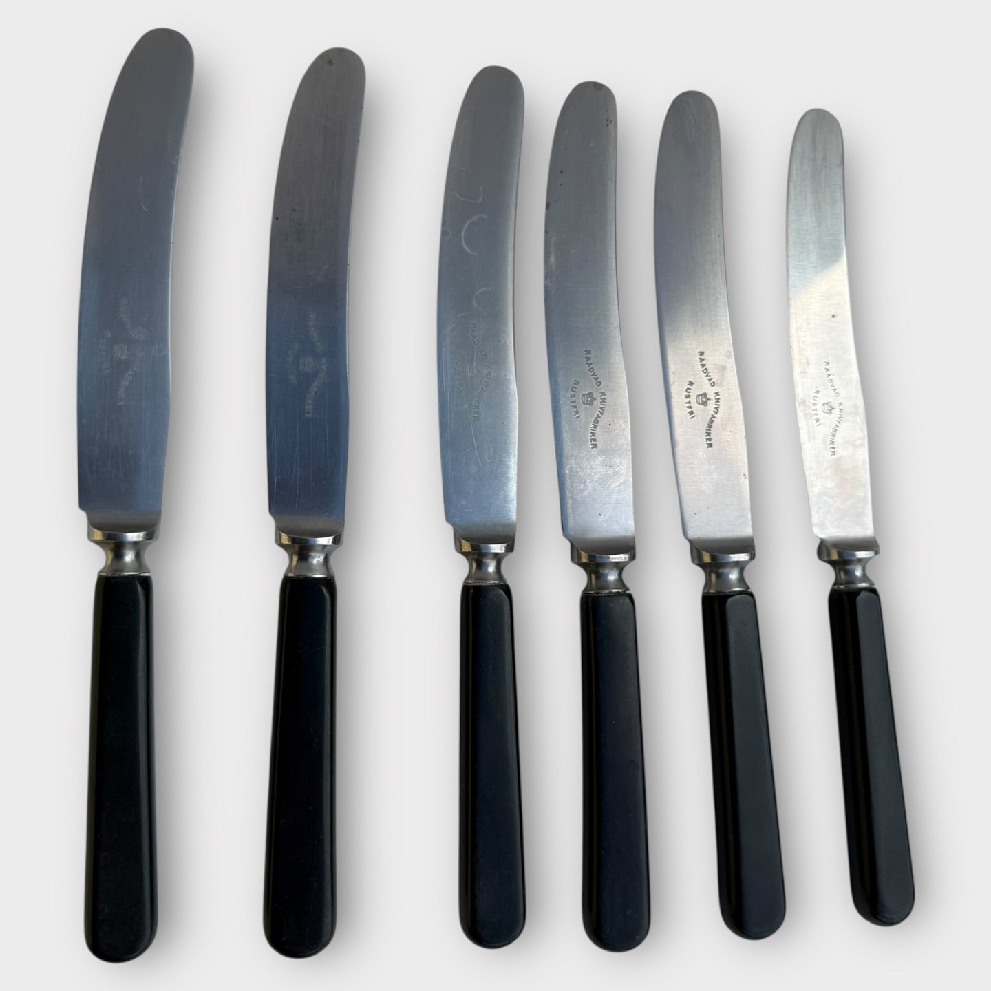Raadvad knivfabrikker, 6 ældre knive med sorte kunststofskafter, længde 20,5cm, pæn brugt stand