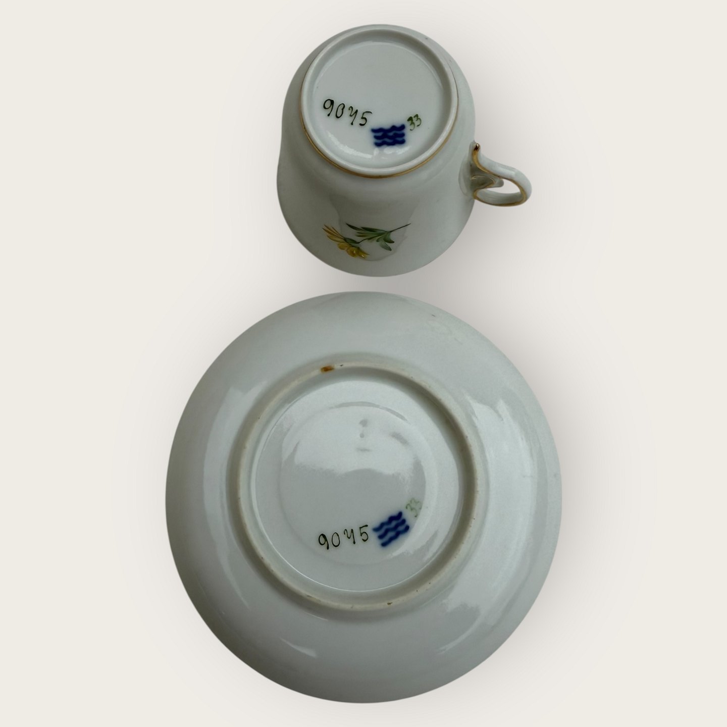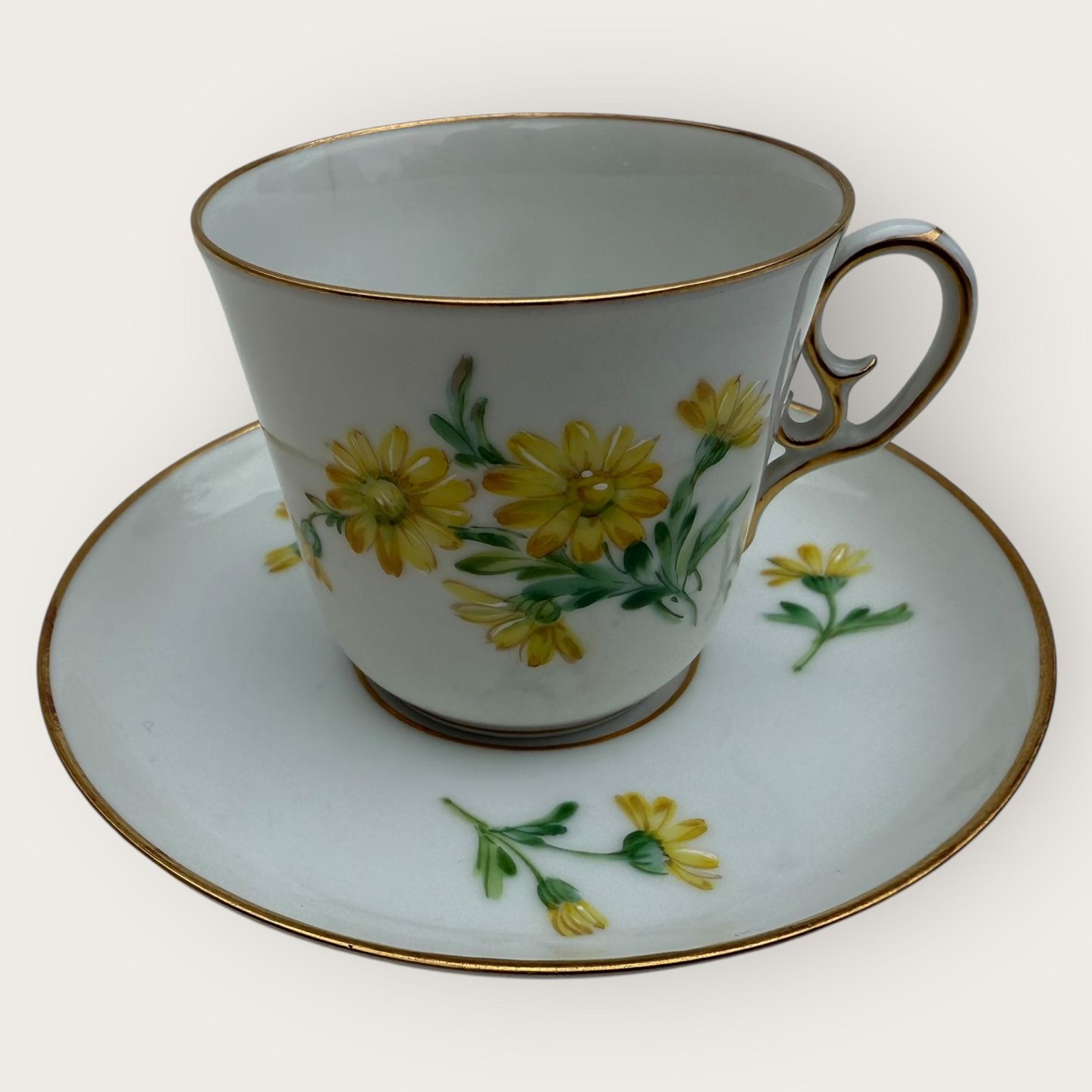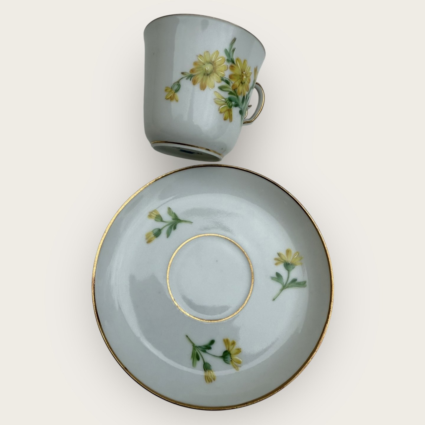 Royal Copenhagen, lille kaffekop i tyndt porcelæn dekoreret med Gul marguerit, #9075, Kop højde 5,5cm, diameter 6,3cm, underkop diameter 8,5, Pæn stand