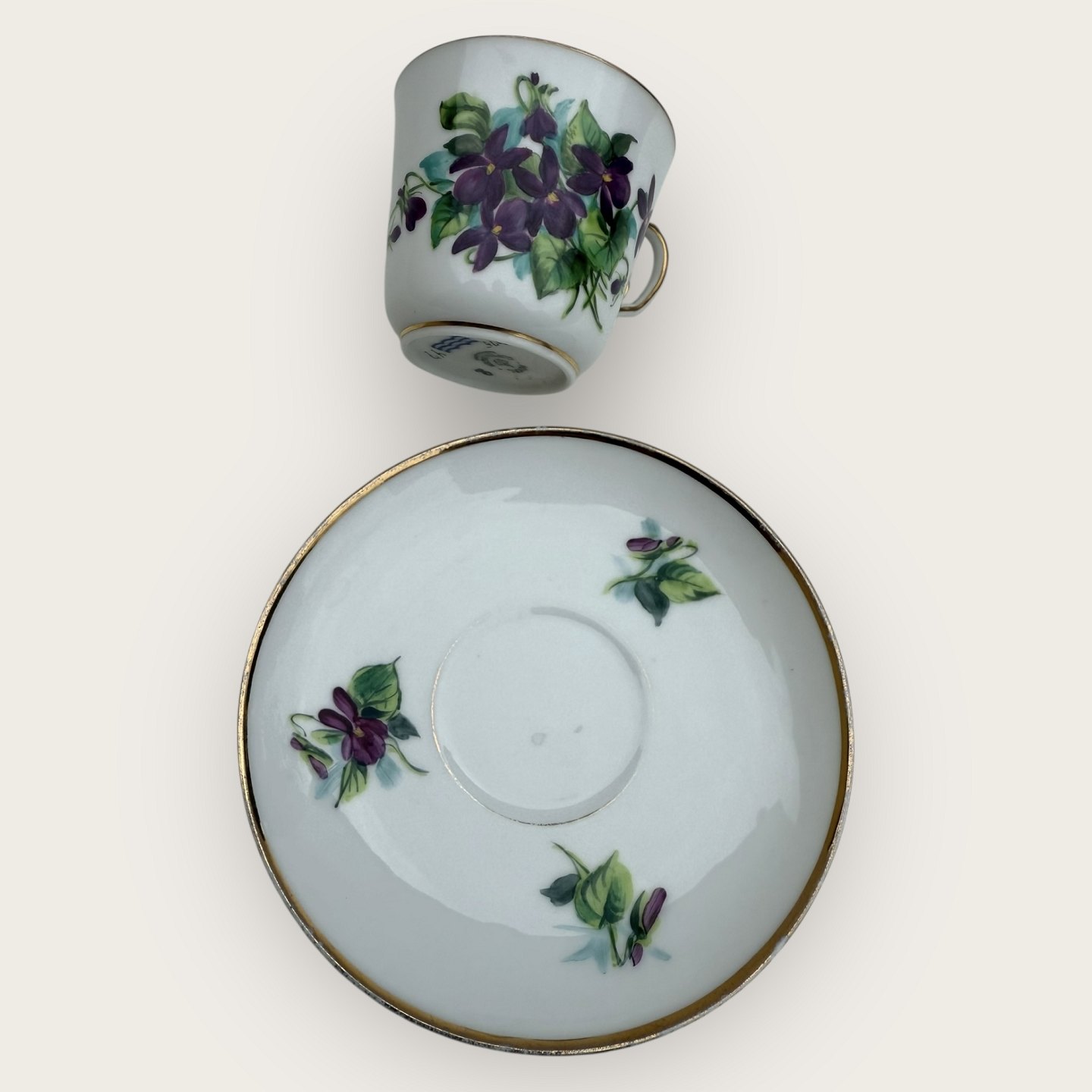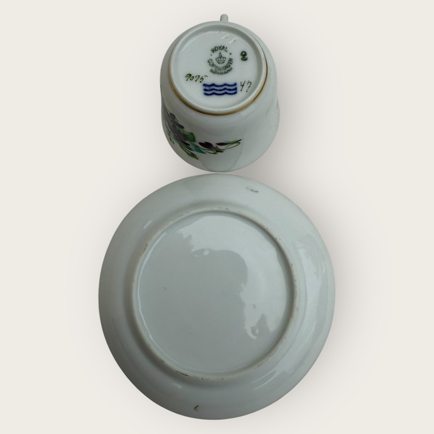 Royal Copenhagen, small coffee cup in thin porcelain decorated with Stepmother flowers, #9075, Cup height 5.5cm, diameter 6.3cm, saucer diameter 8.5, Slight wear on gold rim otherwise in good condition