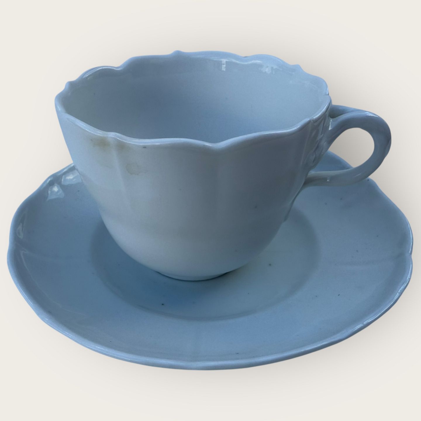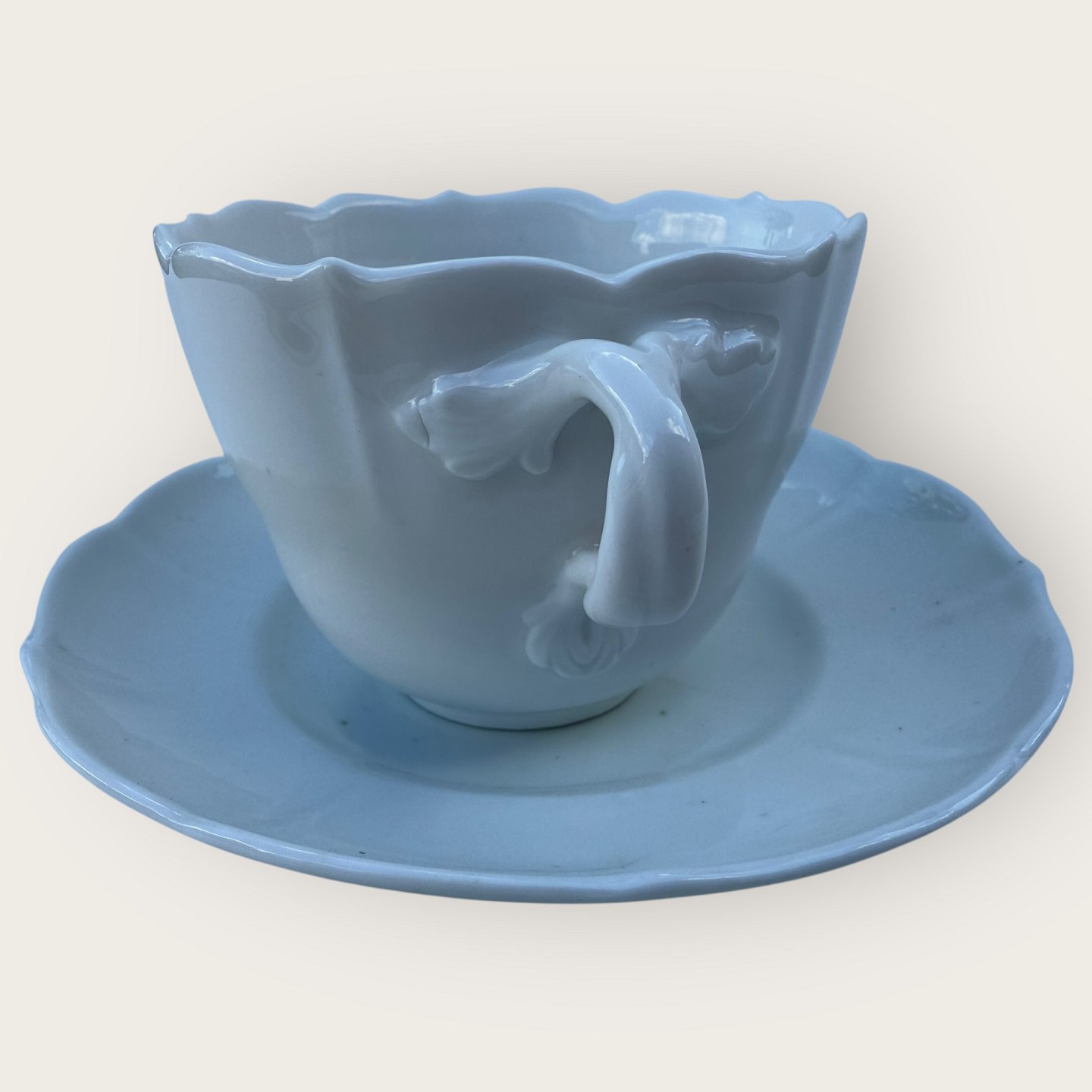 Royal Copenhagen, Hvid stor kop, Antik, 8,5 cm høj og 10 cm i diameter, kop i pænstand, men undertallerken med lille stjerne/sprække (se foto).