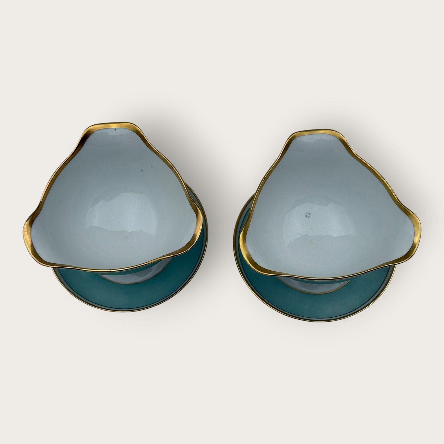 Bing & Grøndahl, Form 643 med bred turkis dekoration og guldkant, Sovseskål, 10,5cm høj, bredde 17cm, 2. sortering, *Et par små mærker under glasuren (se foto) ellers pæn stand*