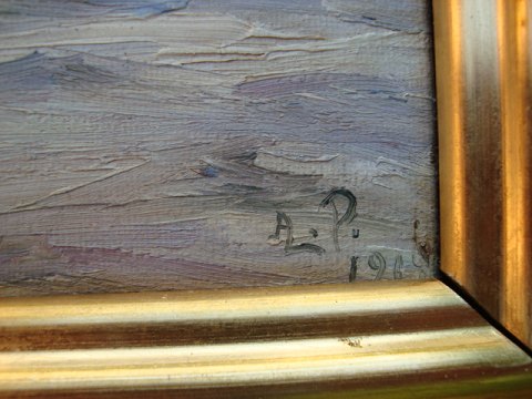Ubekendt kunstner (20 årh): Kystparti med huse og både i havn - Nordsjælland?? Olie på lærred. Sign.: AL.P. (??)(se foto) Dateret - 19?? 32x44 (46x57)