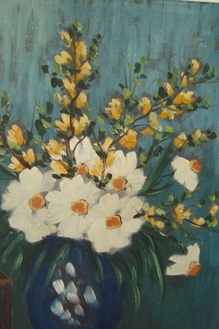 Christian Karup (1911-79): Opstilling med forårsblomster i vase og frugt mv. Olie på lærred. Sign.: Karup 66x56 (70x60)
