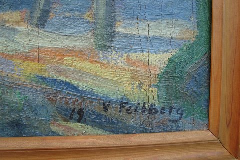 V. Feilberg (20 årh): Byparti 1919. Olie på lærred. Sign.: V. Feilberg 19 Mange krakeleringer. 50x68 (57x75)