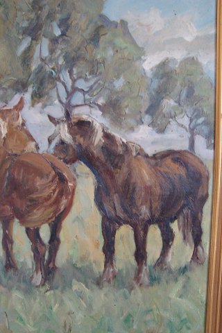 Niels Strøm (1881-1949): Heste på mark ved træer 1930. Olie på lærred. Sign.: Niels Strøm 1930 60x67 (69x77)