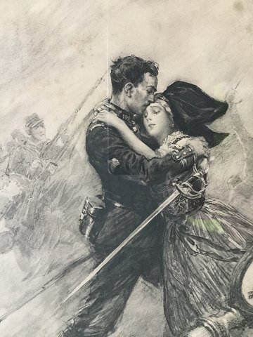 Fransk soldat kysser sin kæreste farvel på Slagmarken Første Verdenskrig 1914.