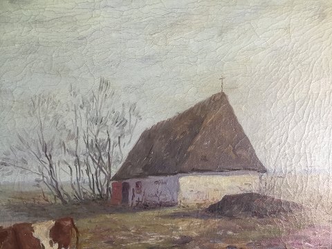 Mark Osman Curtis (1879-1959): Bondemand på vej hjem med kalve.. Olie på lærred. Sign.: Koefod-Hansen (Pseudonym). Nyrenset. Krakelleret. Betegnet - Hjem fra ........ 66x90 (86x110) 6117
