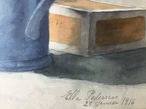 Ella Pedersen (19/20 årh): Opstilling med vinflaske, cigarkasse og krus 1916. Akvarel på papir. Uden ramme. Sign.: Ella Pedersen 27, januar 1916. 37x50 32611