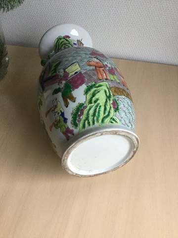 Gammel kinesisk vase. Dekoreret med drage og scenerier med både og personer. 2 ører i form af Fu-hunde. Kina. Højde 31 cm. Diameter i top - 14 cm. Diameter i bund - 12 cm.