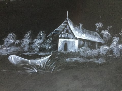 Antik, oval lakeret metal bakke. Sortlakeret dekoreret med kineserier i hvidt og perlemor. Smuk sølv frise rundt kanten. Antagelig England 19. årh. 50x61