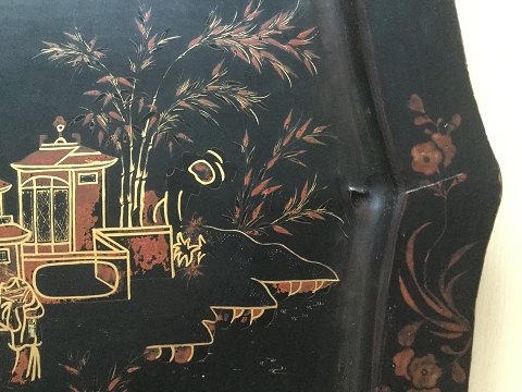 Antik lak bakke. Sort lak med guld og rødbrun dekoration. Barokform. Kina/Japan 19 årh. 47x61