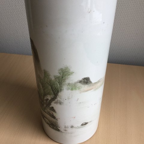 Antik Hatstand vase. Kina 19 årh. Polykromt dekoreret med landskab. Skriftstegn forsøgt fjernet, derefter ridser (se ekstra foto) Stemplet i bund. Højde - 28 cm. Diameter - 12 cm.