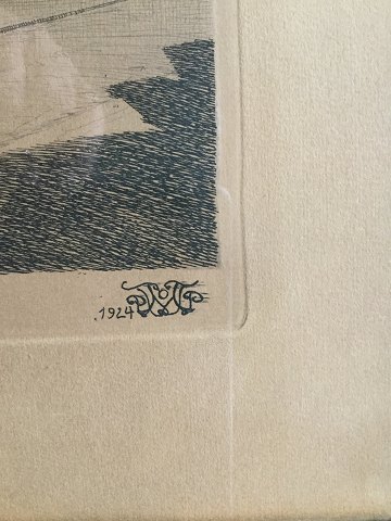 Peter Tom-Petersen (1861-1926): Digegrevens Hus i Tønder 1924. Radering på papir. Sign.: Monogram 1924 Indrammet i smuk guldramme. 32x25 (47x40)