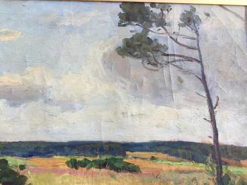 Søren Josva Christensen (1892-1948): Parti fra egnen ved Skørping. Olie på lærred. Sign.: Søren Josva Christensen Bagpå lærred betegnet 1054 Gl. B..... Skørping. Enkelte krakeleringer. 58x80 (71x94)