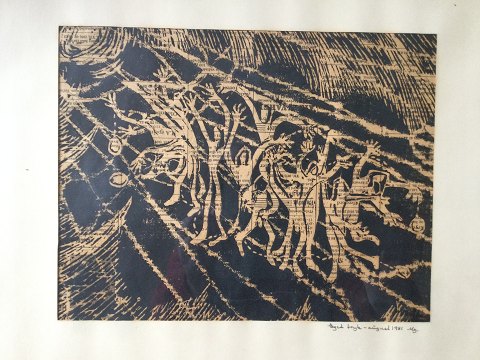 Ubekendt kunstner (20 årh): Glade mennesker august 1981. Træsnit på avispapir. Sign.: Utydelig signatur - August 1981. Eget tryk 21x27 (36x44)