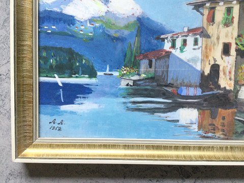 Ubekendt kunstner (20 årh): Parti fra Comosøen, Lombardiet, Italien 1959. Pastel på papir. Sign.: A.A. 1959 Indrammet 25x33