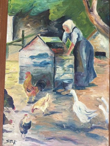 Sigrid Bech-Knudsen (1864-1948): Arbejdende kone på gårdsplads med ænder og høns. Olie på lærred. Sign.: SBK. 63x43 (71x51)