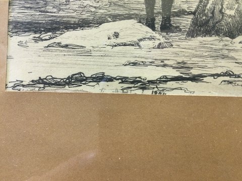 Carl Bloch (1834-90): Blæsevejr, søstykke 1884. Radering på papir. Sign.: Carl Bloch 1884 (i trykket)(næsten skjult af passepartout) 15x23 (28x35)