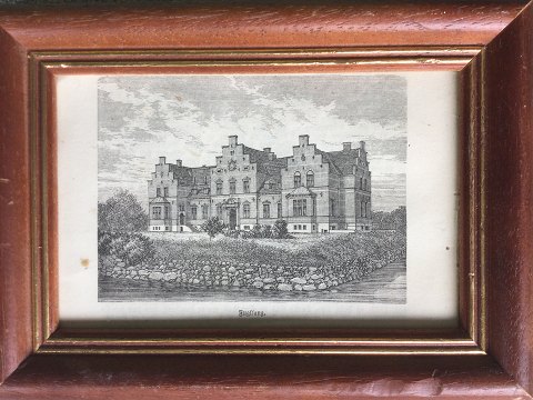 Ubekendt kunstner (19 årh): Fuglsang Hovedgård på Lolland ca. 1870. Xylografi på papir. Usigneret. 10x15 (13x18) Fuglsangs Hovedbygning er opført 1868-69 og ejes i dag af Det Classenske Fideikommis. nr 42