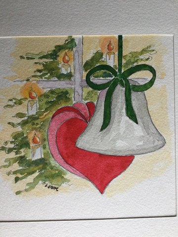 Erik Stuhr (1936-2014): Gren fra juletræ med klokke og hjerte. Akvarel på papir med passepartout Sign.: E. Stuhr Uden ramme. 14x13 (med passepartout 23x16)