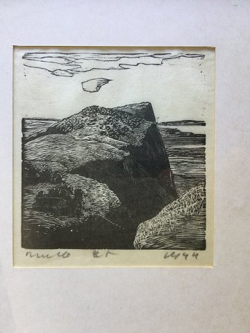 Povl Christensen (1909-77): Hus ved skrænt 1944. Træsnit på papir med passepartout. Sign.: Povl C. 1944 Eget tryk Snittet måler 9½x9 Indrammet med passepartout 20x18.