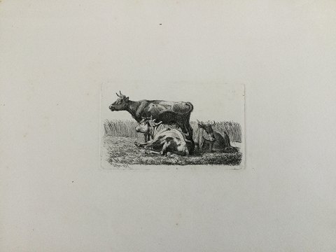 Johannes Vilhelm Zillen (1824-70): 3 køer på marken 1857. Radering på papir. Sign.: W. Zillen 1857 (i trykket) Uden ramme. Bladet måler 27x36 (trykfladen 7x12) 21622