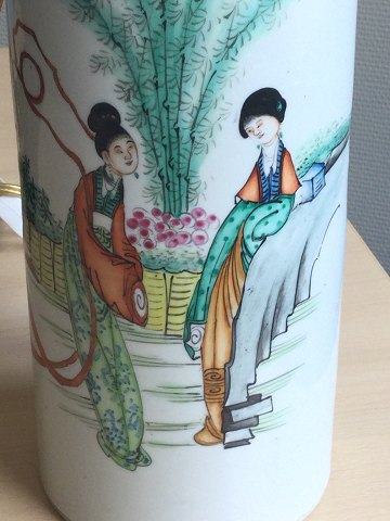Polykromt dekoreret med skrifts tegn og scene med personer.