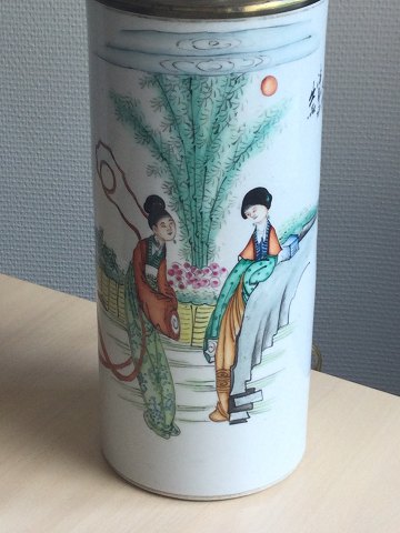 Polykromt dekoreret med skrifts tegn og scene med personer.