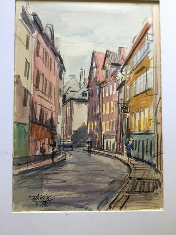 Kai Molter (1903-77): Gadeparti fra København 1961. Akvarel/pen på papir. Sign.: K. Molter 1961. Uden ramme. Mål med passepartout 29x22 - uden passepartout 21x15 23322