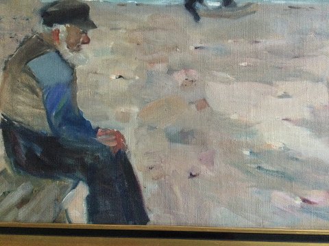 Parti fra Vestkysten med fiskere på stranden.