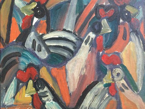 Eyvind Olesen (1907-95): Komposition med fjerkræ 1968. Olie på lærred. Sign.: Eyv. Olesen 68. Uden ramme. 40x50