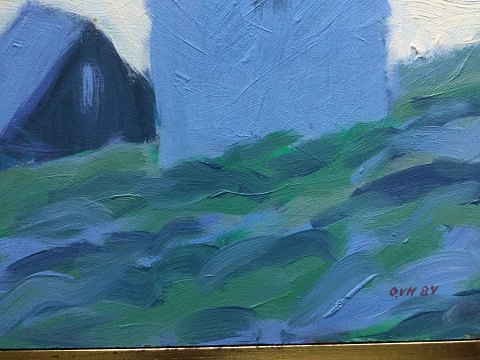 Ole Vang Hansen (1924-97): Landskab med huse fra Færørene 1984. Olie på plade. Sign.: O.V.H. 84. 25x30 (27x32)
