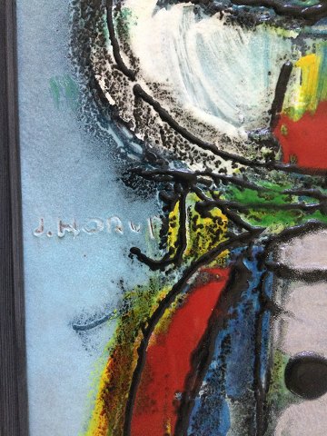 Jens Horup (20 årh): Abstraktion med person. Emalje på plade. Sign.: J. Horup 41x31 (62x52)