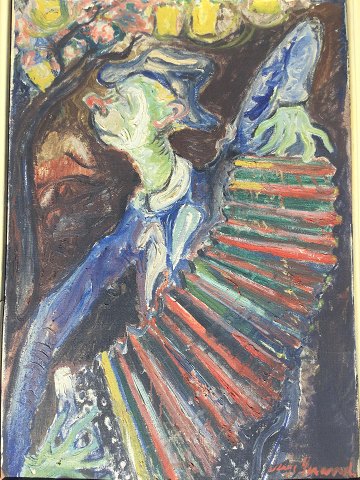 Aage Strand (1910-75): Hamonikaspillende klovn. Olie på lærred. Sign.: Aage Strand 70x49 (77x56) Åge Strand