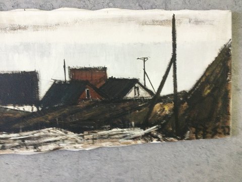 Peder Brøndum Sørensen (1931-2001): "Figurer og huse ved havet" 1972. Olie på lærred. Sign.: PBS Bagpå - Peder Brøndum Sørensen 72 samt "Figurer og huse ved Havet" Uden ramme. 30x100 15023