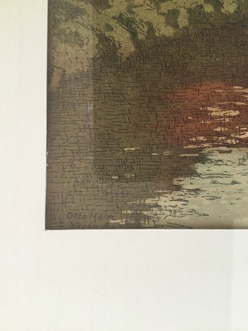 Otto Holm (20 årh): Parti fra Vejle med åen og Sankt Nicolai Kirke. Farveradering på papir. Sign.: Otto Holm i trykket. Betegnet - Vejle Aa: 33x24 (49x40) 36305